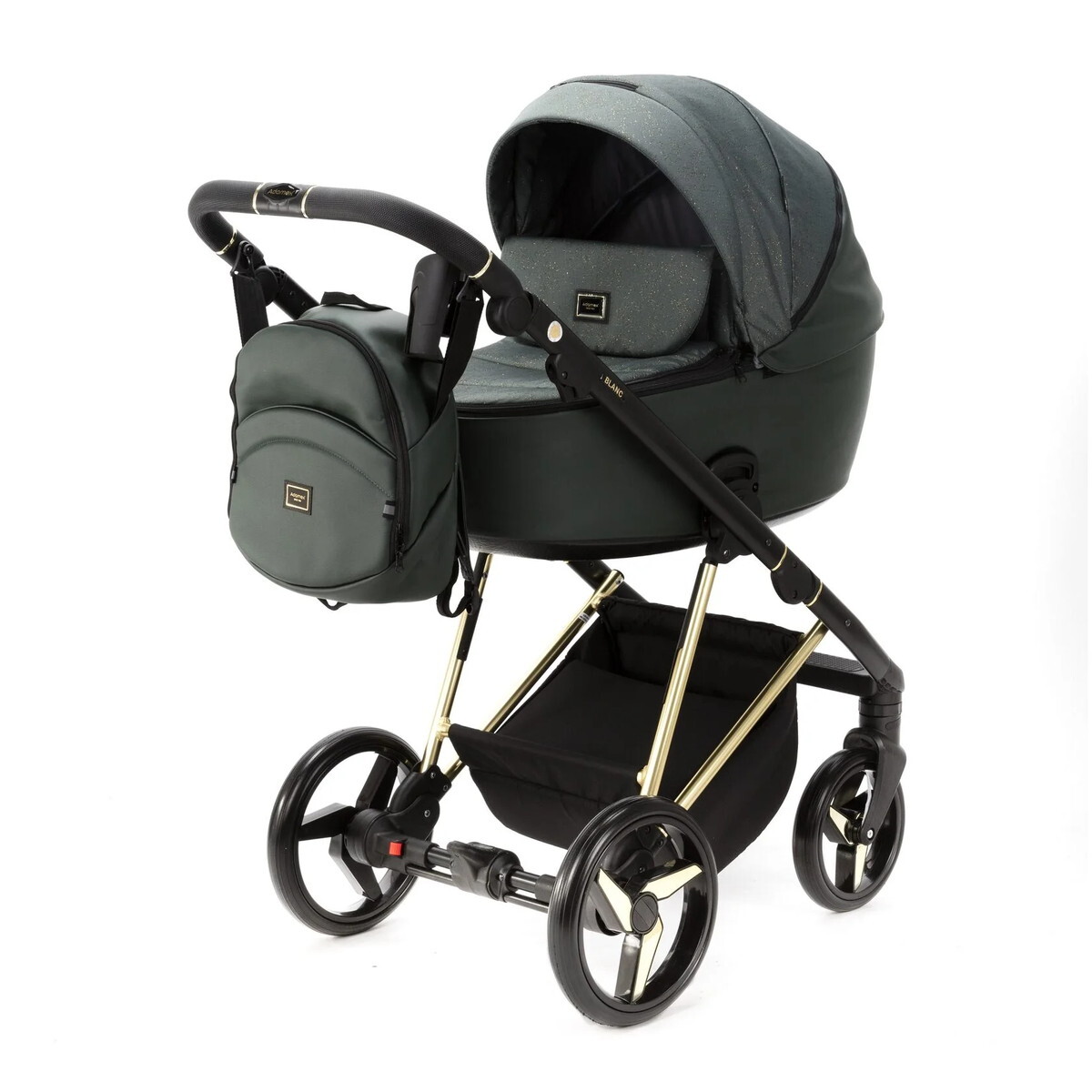 Детская коляска Adamex Blanc Special Edition 2 в 1 BL-PS788 (ЗЕЛЕН.В БЛЕСТКУ+Т.ЗЕЛЕН. КОЖА+ЗОЛОТО РАМА)