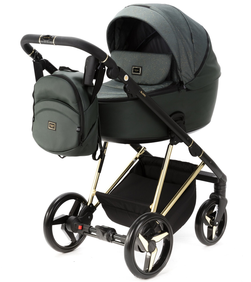 Детская коляска Adamex Blanc Special Edition 3 в 1 BL-PS788 (ЗЕЛЕН.В БЛЕСТКУ+Т.ЗЕЛЕН. КОЖА+ЗОЛОТО РАМА)